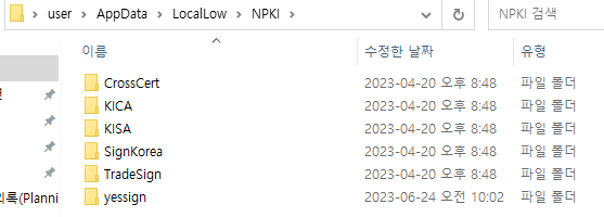 3.Appdata 폴더 -> LocalLow폴더 -> NPKI 폴더:인증서보관 폴더 위치